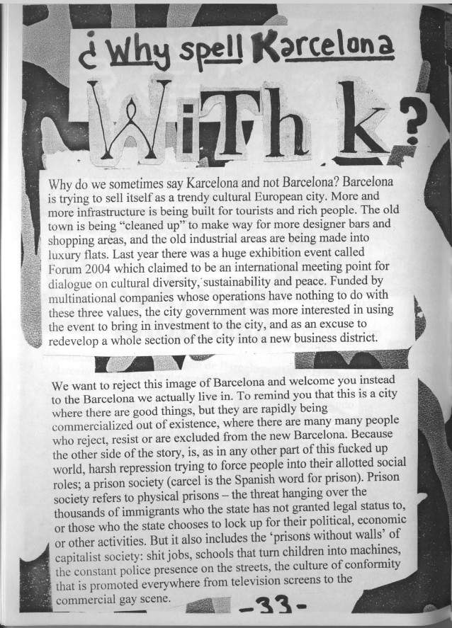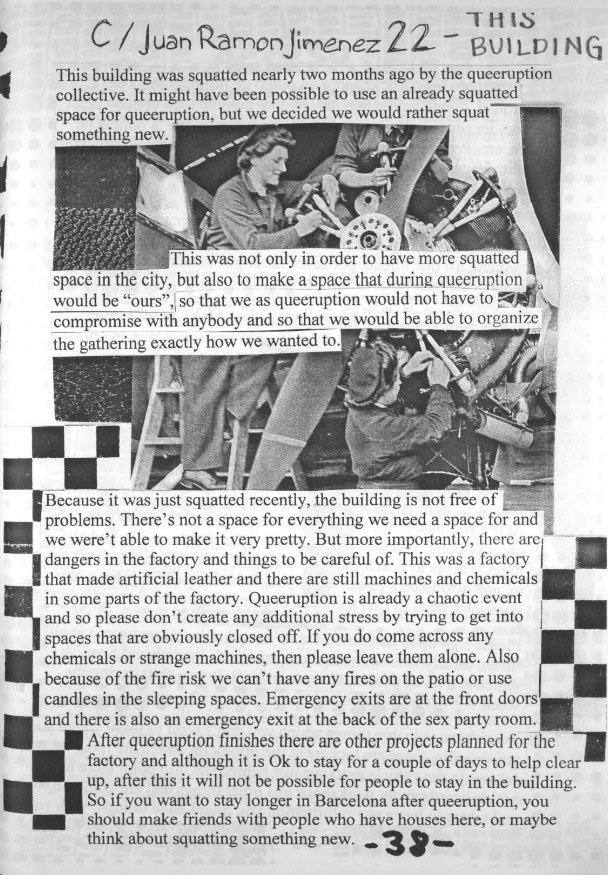 The festival zine for Queeruption Barcelona reminds participants that to make the event successful, they needed to take part in “DJing, performing, dressing up, dancing, flirting, fucking, talking, laughing, and meeting new people… Wash your own dish, clean a toilet once this week, chop a carrot!! CONTRIBUTE!!! DON’T JUST CONSUME!!!”